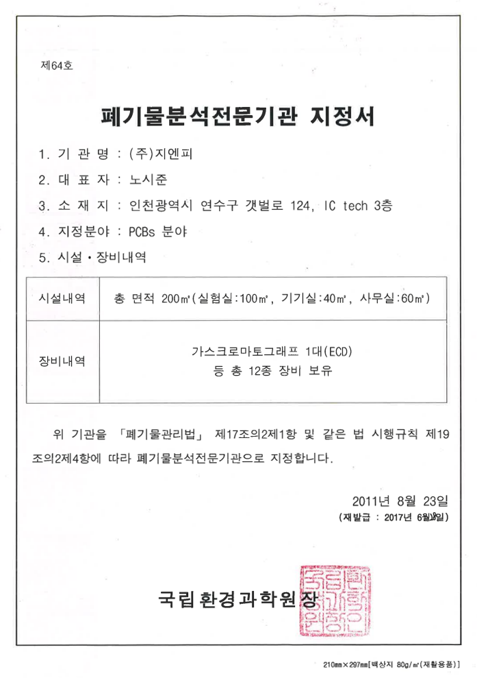 폐기물분석전문기관지정서(PCBs)