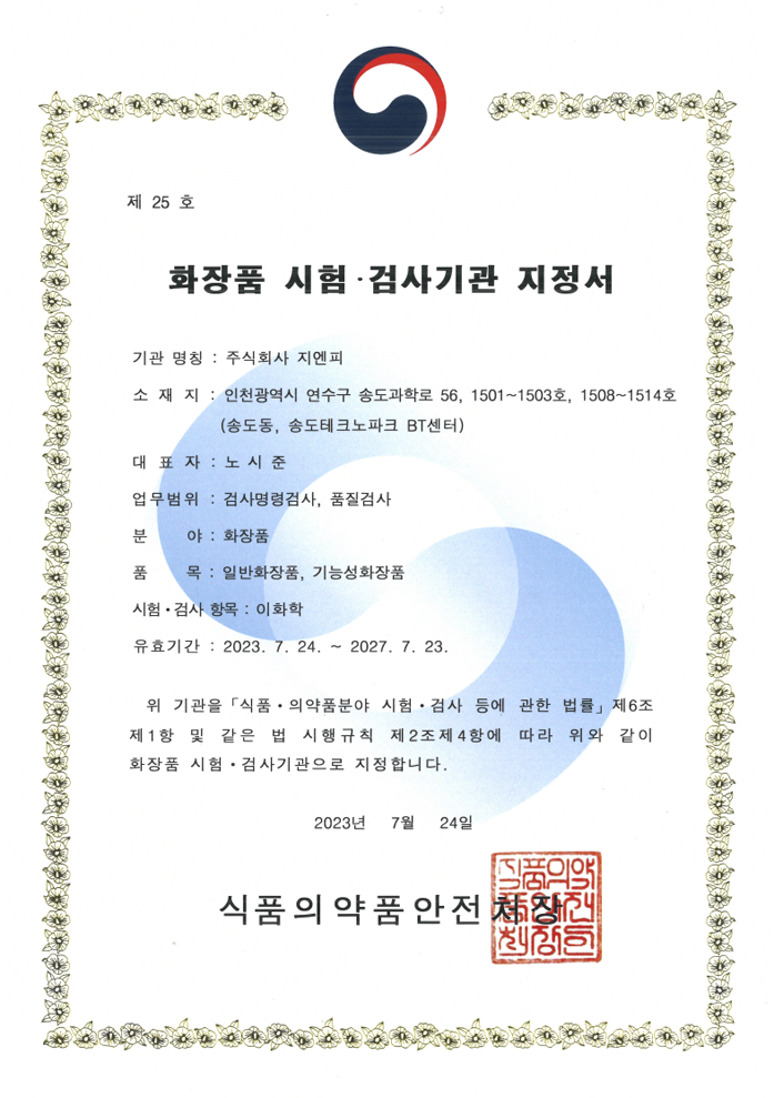 화장품시험검사기관지정서